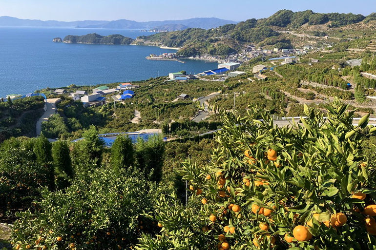 石積みの段々畑をつくるには長い年月を要しますが、急斜面での作業負担が軽減されたり、土壌が崩れるのを防ぐなど、生産者を守る知恵が詰まっているんですよ。5月頃にはみかんの白い花が咲き、秋にはオレンジ色のみかんが実って、青い空と紺碧の海と共に美しい自然美を愛でることができます。