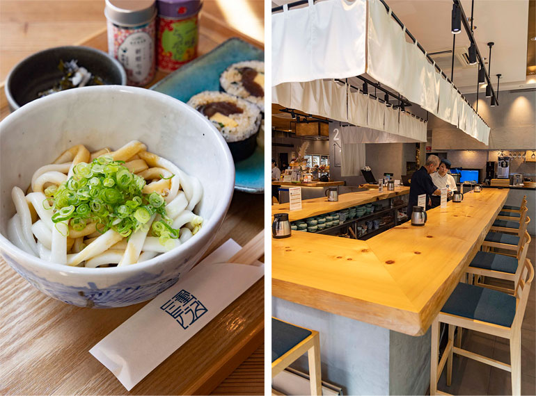 ▲(左)木の温もりが感じられるセレクトショップのような店内。(右)伊勢市民御用達のもちもちしたみなみ製麺の伊勢うどん(生ゆでタイプ)180円とたまり醤油と出汁がしっかり効いているマルキのたれ177円。