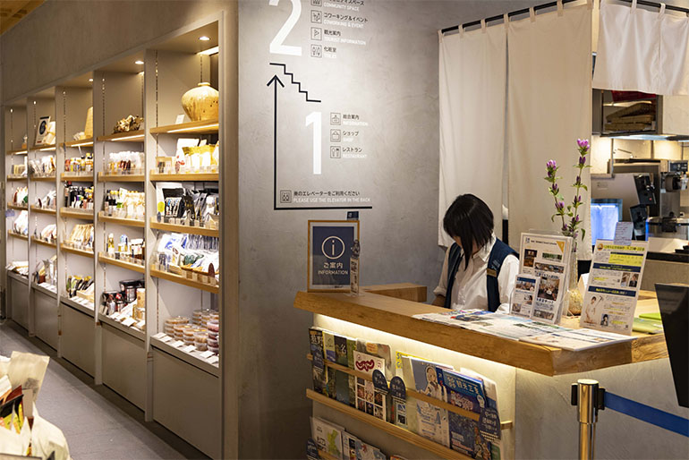 ▲(左)のれんが目印、日本橋らしい落ち着いた雰囲気が漂う三重テラス1階の入り口。(右)ショップ内に併設されている1階の総合案内。