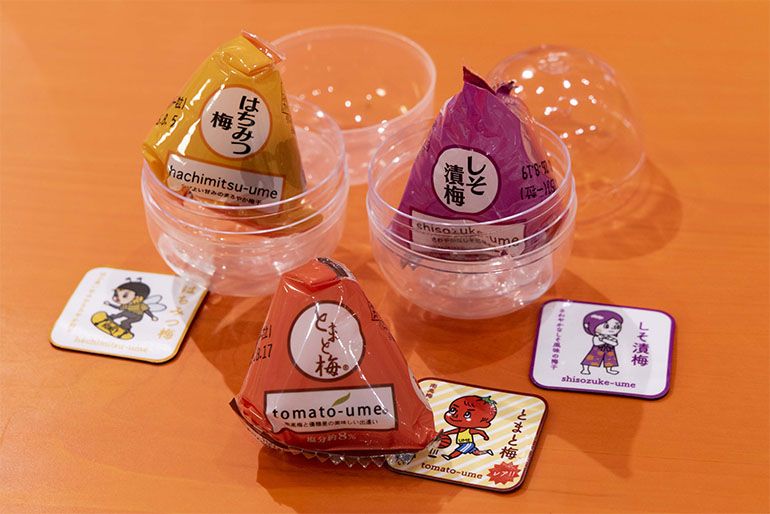 ▲「とまと梅」「白干梅」「はちみつ梅」「塩零梅」「うす塩味梅」「しそ漬け梅」の6種類がそれぞれ丸いカプセルに入っている「梅干ガチャ」は1回200円(1個入り)。