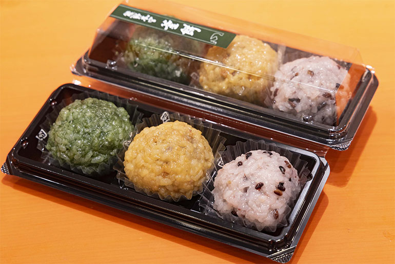 ▲(左)和歌山県東京観光センター。(右)もちもちした釜餅は、よもぎ、くるみ、古代米の3種類 670円。