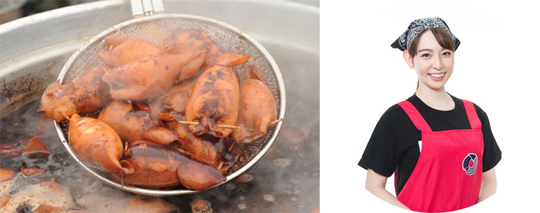 ▲(左)秘伝のタレでしっかりと味付け。(右)3代目として老舗の看板を守る麻椰さん。出典:いかめし阿部商店(URL)