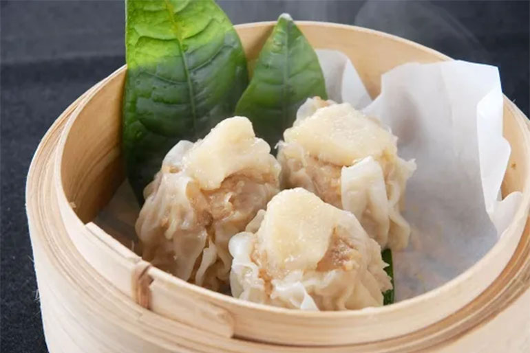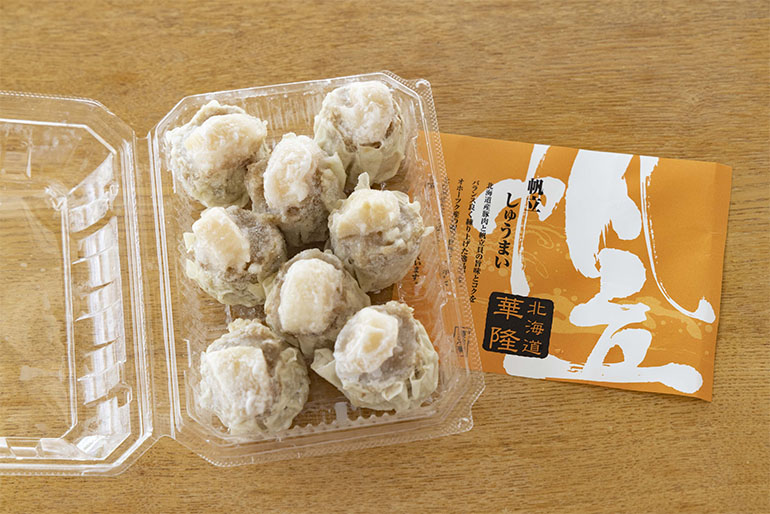 北海道産の天然帆立貝を使用し、大きな貝柱をトッピングしたのが、華隆の「ホタテしゅうまい」。フレッシュポークと帆立貝の旨味とコクをバランスよく練り上げて素材の旨味を追求。添加物、保存料は一切使用していない安心のおいしさだ。