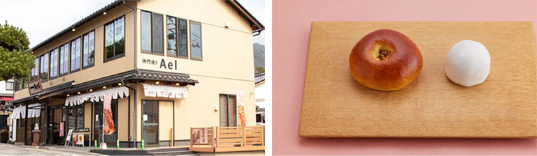 ▲(左)出雲大社前に佇むベーカリーAel。(右)薯蕷饅頭「朝汐」のあんを使用した「朝汐あん」324円(画像/彩雲堂 URL)。