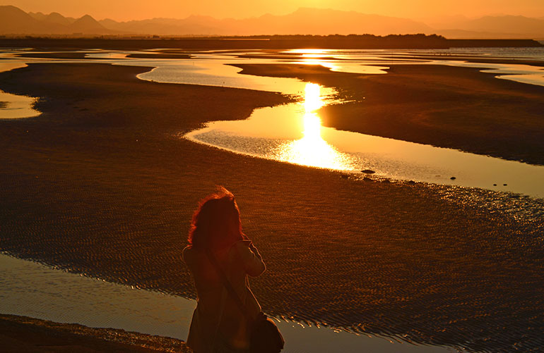 ではなぜ、夕暮れに美しいしま模様ができるのか。真玉海岸は遠浅の地形で、潮の干満差が大きい。さらに真玉海岸は大分県で唯一、西側にある海岸なので、砂紋の間に残る水に夕陽が映り込むことから、しま模様が一層くっきりと浮かび上がる。