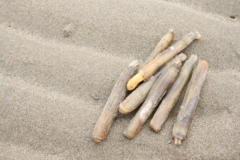 潮干狩りといえばアサリが一般的だが、真玉海岸は細長い筒状のマテ貝が採れることで知られている。春(3~5月ごろ)には、干潮時に「マテ貝掘り開放日」として開場し、チケットを販売する。