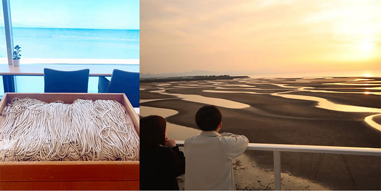 真玉海岸は、晴天と干潮が揃った夕暮れ時にだけ現れる奇跡の絶景で、日本の夕陽百選にも選ばれている。