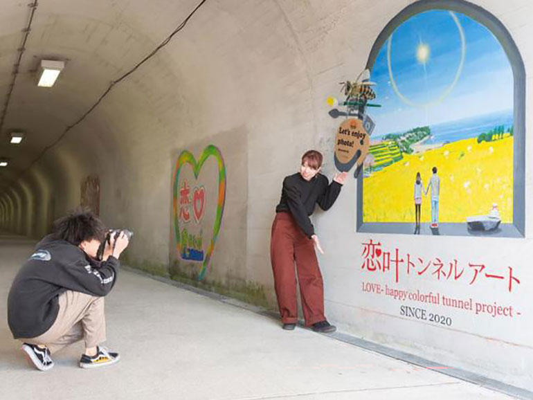 真玉海岸に行くなら、約20km続く“恋がかなう道”「恋叶(こいかな)ロード」へドライブ! 縁結びの神様「粟嶋社」では、海中に石を投げ込む願い石“叶え岩”で願掛けができる他、壁画が楽しい「恋叶トンネル(真玉人道トンネル)」も見どころ。ゴールは花とアートで知られる岬エリア「花とアートの岬・長崎鼻」へ!
