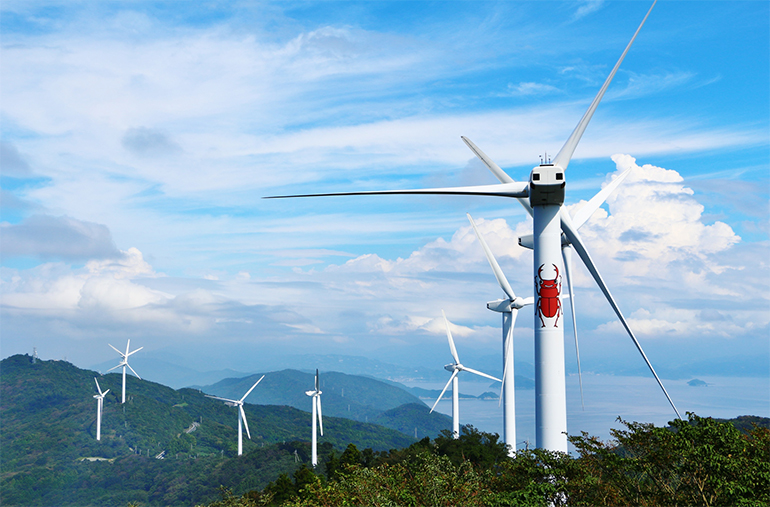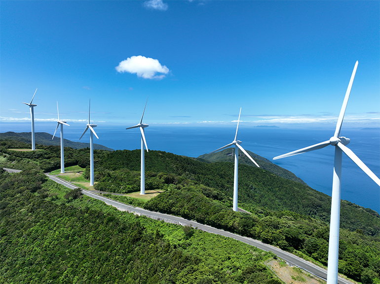 道中は「裏メロディーライン」への寄り道もおすすめ。せと風の丘パークから瀬戸アグリトピアまで向かう間の道沿いに風力発電の風車が並び、白い風車と青い海が重なった風景の中を走る、佐田岬半島ならではの爽快なドライブが楽しめる。