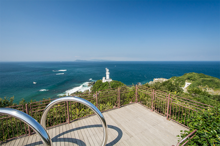 遊歩道の途中、灯台の250m手前にある椿山(つばきやま)展望台は、灯台と豊予海峡を一望できる絶景スポット。木製のベンチがあるので、ゆったりと海と空の静かなダイナミズムを体感したい。