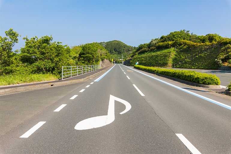 メロディーライン(メロディー道路)とは、走行時に路面の溝に響いて曲が聞こえる仕組みの道路のこと。佐田岬半島の国道197号は、半島付け根の八幡浜市内から三崎港までの約39kmが「佐田岬メロディーライン」と呼ばれていて、時速約50kmで走ると「みかんの花咲く丘」や「海」のメロディーが流れる区間がある。