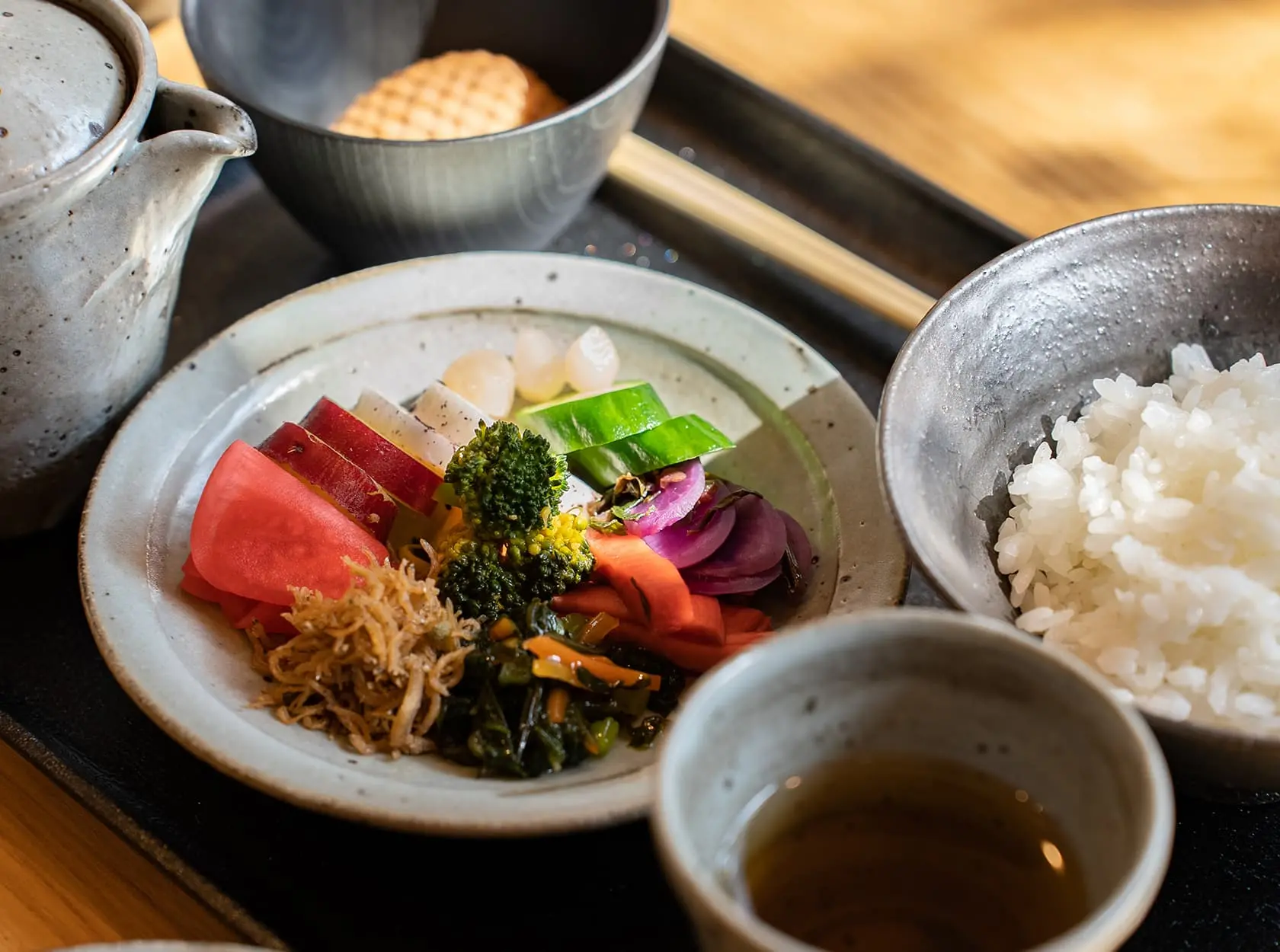 厳選した20種類以上の漬物に加え、奈良県産の米と、奈良の郷土料理である茶粥が、おかわり自由で楽しめる。同店は、奈良のミシュラン二つ星の日本料理店「夢窓庵」が手掛けているだけあって、味のよさはお墨付きだ。